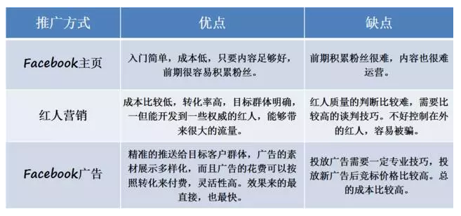 千万不要忘记,我们还可以通过赠送礼物或者给予折扣,把近来的顾客或者老顾客变成忠实的粉丝。 最后,我们看一下Facebook三种推广方式的对比: