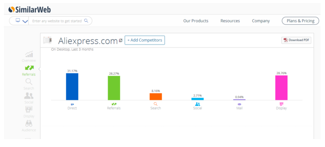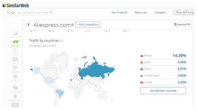 如果你想查看感兴趣的主页的粉丝分布你可以使用socialBaker和 Facebook 自带的audience insight工具。如果想查看感兴趣的网站的流量来源,你可以使用similarweb工具。如利用similarweb查看Aliexpress的流量来源(如下图所示):