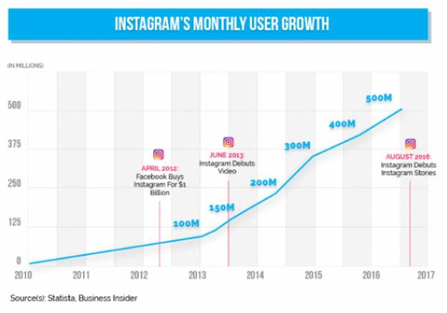 根据mediakix的数据整理,截至2016年年底,Instagram上有高过五亿名用户,其中三亿人每天会使用Instagram,这也使得其变成排在Facebook与YouTube后第三多使用者的社群平台。