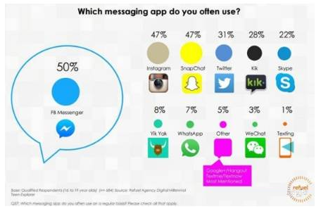 另外,refuel agency也统计,千禧世代的使用者除了使用Facebook的Messenger至外,Instagram与SnapChat是他们日常第二高使用频率的通讯软件,比率高达47%。