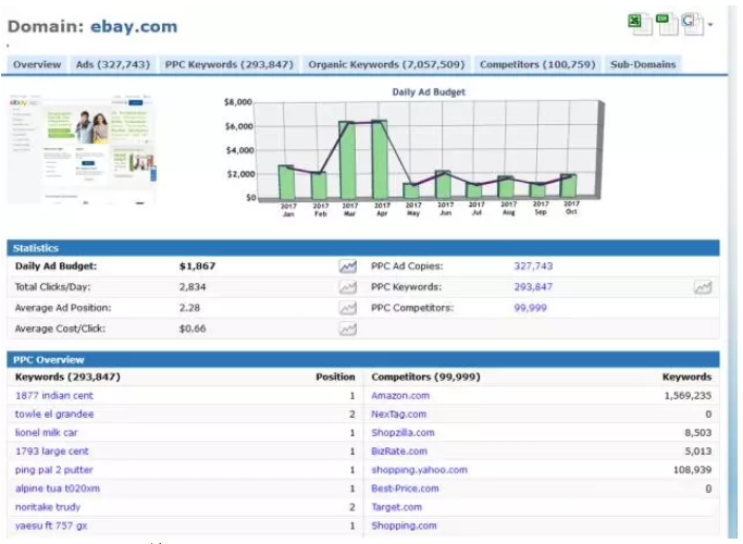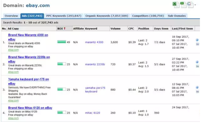 之后我们点击Ads就能看到这个网站的广告词、广告描述、着陆页、关键词、搜索量、点击费用等等。
