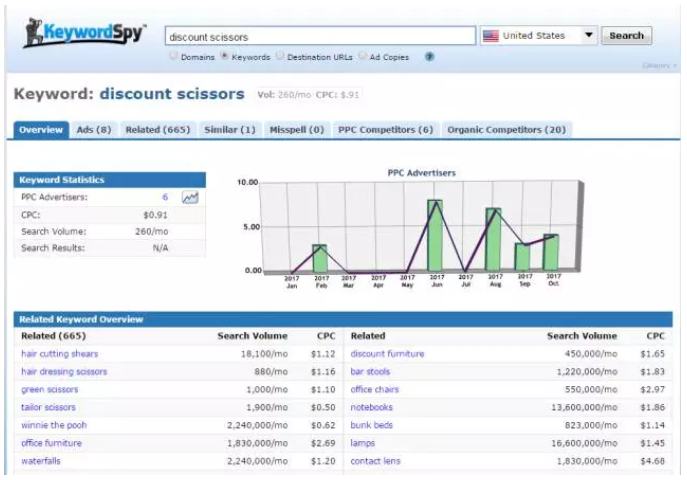 如图我点击discount scissors 这个关键字,工具会自然的给我关于这个关键字的相关关键字,如下图:
