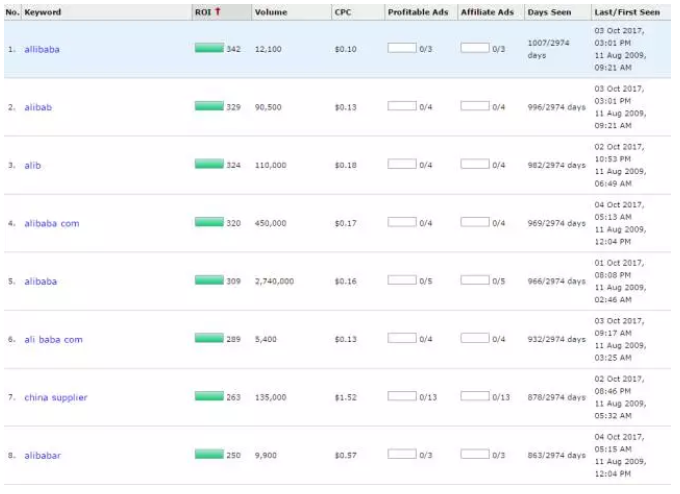 比如我们点击PPC Keywords,查看这个网站购买了哪些谷歌关键词,会得到下面这个结果: