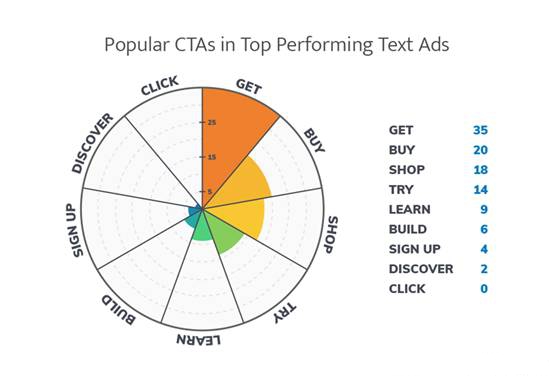 虽然CTA短语会根据具体情况略有不同,但企业希望潜在用户采取行动时,所能用的动词相当有限。分析了最受欢迎的非品牌文字广告后,结果显示最受欢迎的CTA词排名是(按每个动词在广告中出现的数量):