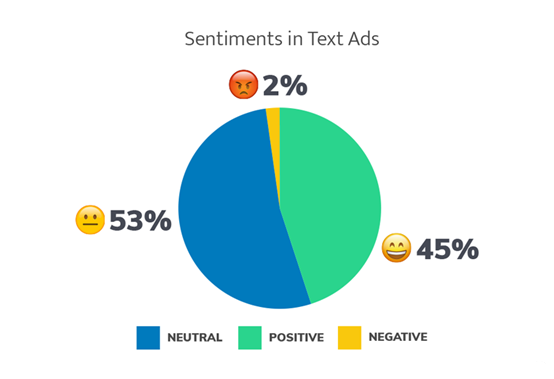 利用Vader情感分析工具和Python的NLTK图书馆来决定最佳广告中的情绪(积极、消极或是中立)。最终发现,有45%的广告文本传递的是积极的情绪,53%传递的是中立的情绪,只有2%传递了消极的情绪。