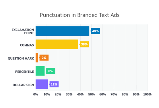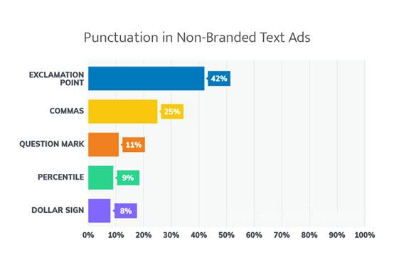 有趣的是,非品牌广告文案中货币符号的使用率比品牌广告低约3%。非品牌广告中各标点符号的使用率如下: