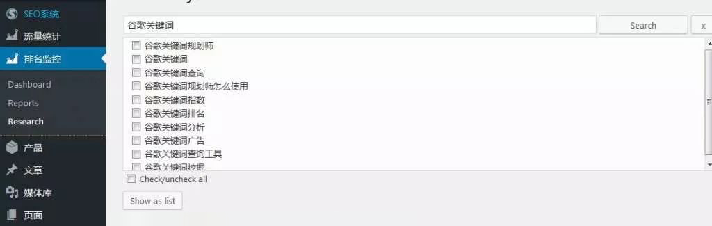 1.在排名监控,模块点击Research.输入你需要拓展的关键词。