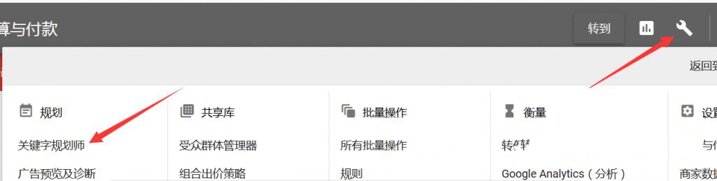 好的我们进入Google Adwords,点击导航栏的小扳手,点击下拉菜单中的关键词规划师。