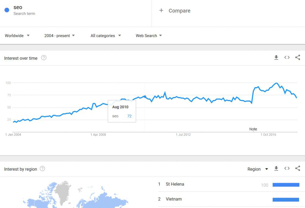 当我们在Google adwords找到我们需要的关键字之后,如果想判断产品的淡季旺季,或者产品以后的发展空间,这里我们就用的到Google Trends(https://trends.google.com)。以SEO为例,我们可以得到04年至今的搜索趋势数据,当然也可以精准到最近4个小时,我们看下04年至今的数据吧(下图)。通过下图清楚的看到 SEO这个行业,从04年至今一直呈上升趋势,看样子比较热。不过搞不懂的是相对来说比较重视seo的竟然是St Helena这个小国家。