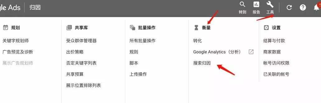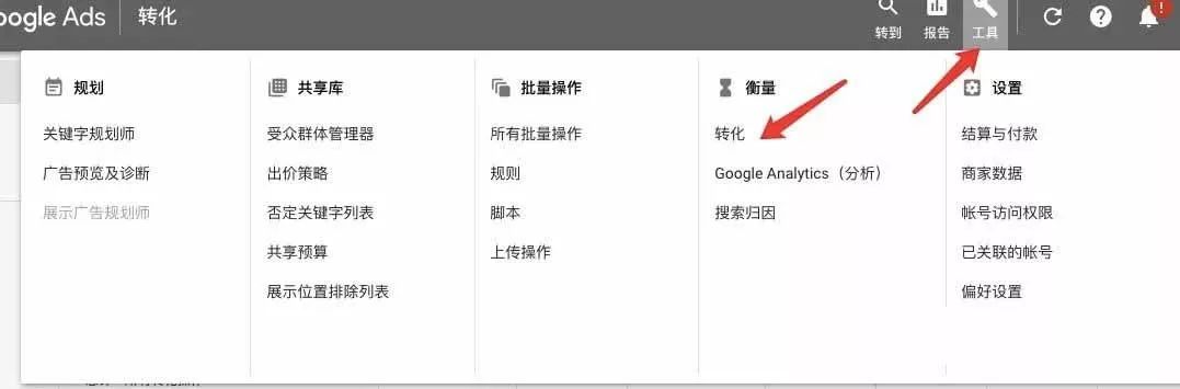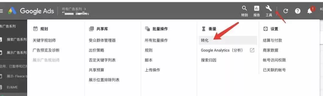 首先,登入Google Ads后台:依次点击右上方的工具—衡量—转化