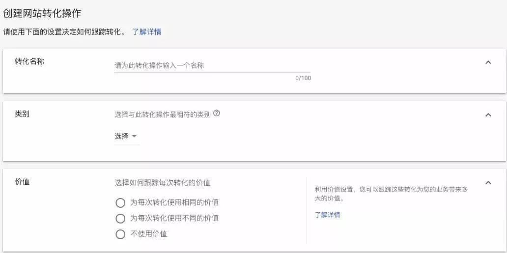 比如,如果某个转化行为,给你带来50美元的收益,你可以在这里设置为50美元。但对于一般的B2B网站,此选项直接设为不使用价值即可。