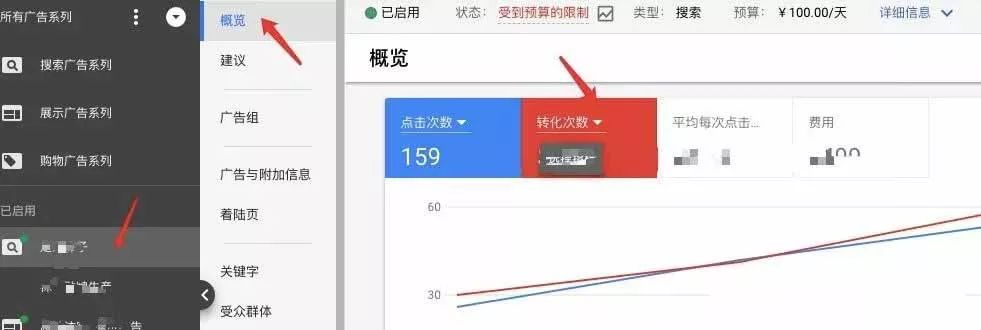 1)点击概览,可以看整个账号、某个广告系列或者某个具体广告组的转化次数或转化率。从而得出订单转化率,找出好成单的产品种类。