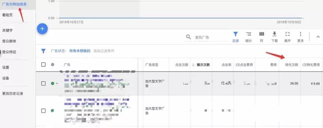3)点击广告与附加信息,可以看到具体每个广告带来的转化次数,可根据转化率高的广告的特征去优化其他广告。