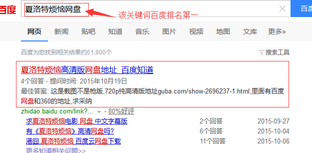 由于百度对于自家产品给予的排名相对较高我们除了在论坛贴吧引流外还选择了百度知道这一平台。而在知道中我们的标题用:xxx网盘地址、xxx 高清网盘地址、xxx下载链接、求xxxx网盘等等带上“求”、“网盘”、“链接”这样的词汇更加符合用户的搜索习惯,这样的关键词放在标题中当用户搜索 相关关键词之后更容易出现在搜索结果中。如图我这“夏洛特烦恼高清版网盘地址”已经是“夏洛特烦恼网盘”、“夏洛特烦恼高清网盘地址”等关键词搜索结果的 第一位。