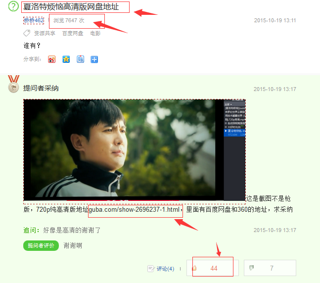 接下来我们就需要找朋友点赞,当问答有十几个赞的时候,就基本上已经被收录了,此时我们就可以去一些知道互赞,互答等qq群推广推广,当由用户通过 这个知道到达我的网站帖子获得他想要的结果,有的是会回来点赞的就像这个知道40多个赞基本都是普通用户点的而不是刷的,在这种状态下这个知道就更容易被 百度推荐并出现在搜索结果中获得好的排名。慢慢地陷入一个良性循环,在这期间我们还需要经常去我们网站的帖子看网盘有没有失效等等,只有真实有效的分享才 能获得用户的认可。这条知道直到目前已经带来了数万流量虽然显示的只有7647条阅读,但这里的统计有缺失,并非那么的精准。