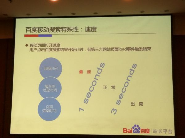 首先,我们先看一下在0910百度站长大会上的一张图片“百度一定搜索特殊性:速度”。从图片中我们可以看到,百度移动搜索计算网站移动页面打 开速度是从“用户点击百度搜索结果开始计时,到第三方网站页面LOAD事件触发结束”,也就是说当用户搜索搜索引擎点击你的网址,到你网站打开页面的这个 时间,百度进行判断你网站的速度如何。从其中分出“最佳、正常、出局”三种。最佳说明你的网站打开速度比较快,比较好,是受到搜索引擎喜爱的。正常说明你 的网站速度一般,是可以打开的,搜索引擎在速度方面不会给你加分也不会减分,但是给与最佳排名的友好程度要高于正常。出局这个相信大家都能理解,也就是网 站的速度很慢,或者打不开。这样的网站搜索引擎通过用户的行为,一次两次三次之后,你网站将被淘汰,不被显示在搜索结果之上。