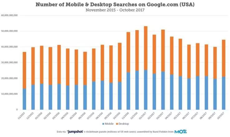 +1 ——我们通过Jumpshot获得PC和移动搜索量数据,显示前者确实保持相对平稳,而另一个则持续增长。