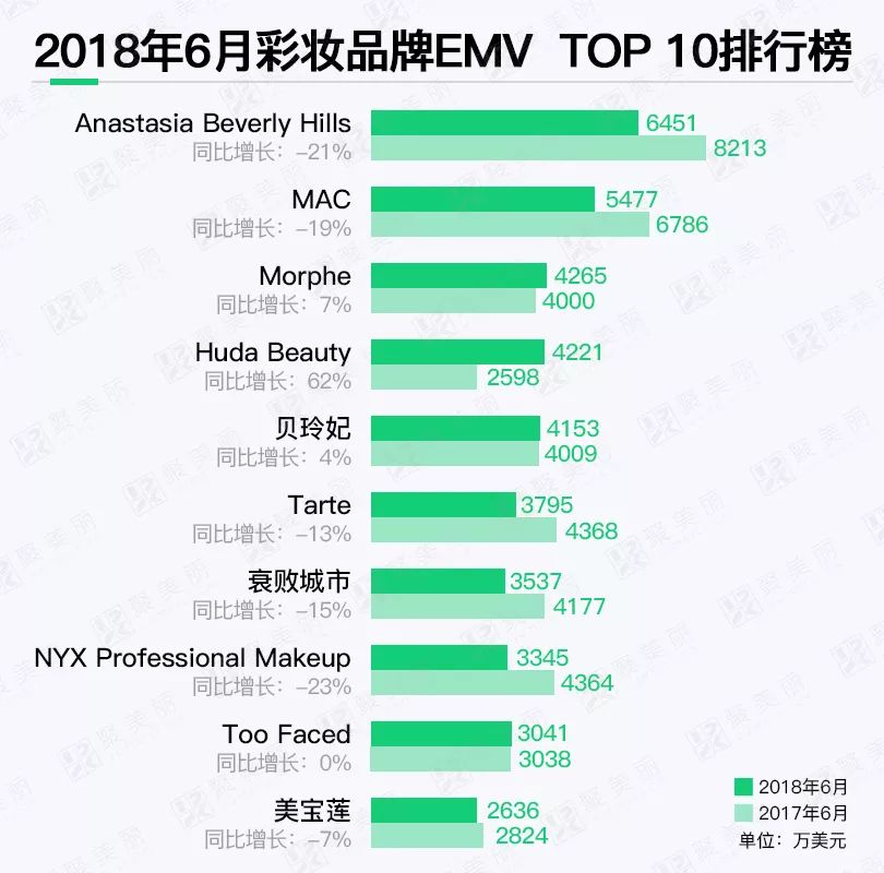 从1月到6月,彩妆品牌Anastasia Beverly Hills一直排名第一,6月的赢得媒体价值为6451万美元,但和去年同期相比下降21%。