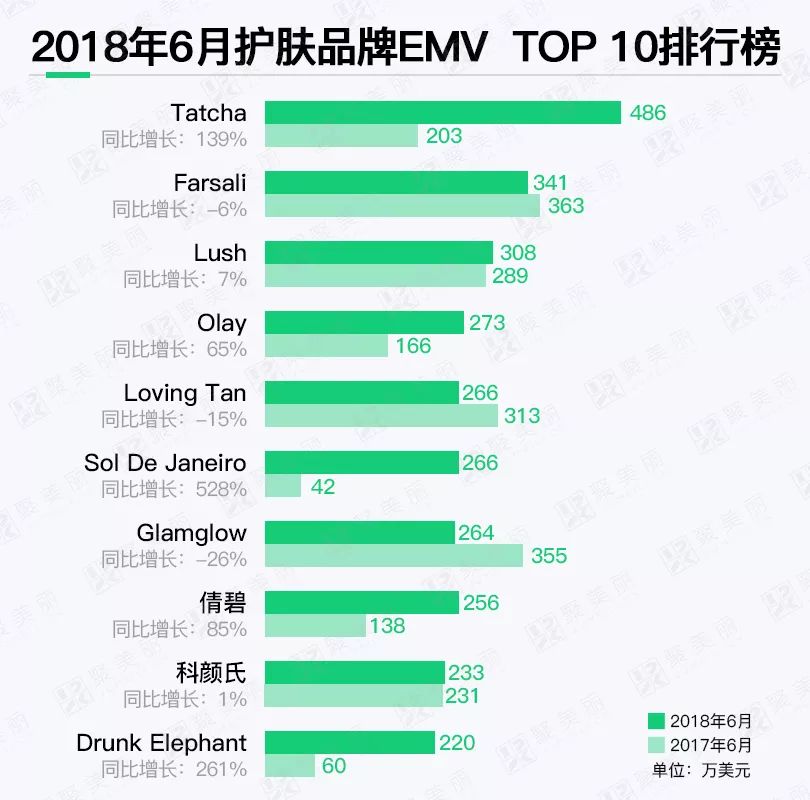 稳坐第一的护肤品牌Tatcha在6月份的赢得媒体价值为490万美元,同比增长139%。在一定程度上,这一进步来自于该品牌2月推出的妆前乳The Silk Canvas primer,它从5月到6月一直是Tatcha最热门的产品,有111名品牌大使贡献了130万美元的赢得媒体价值。