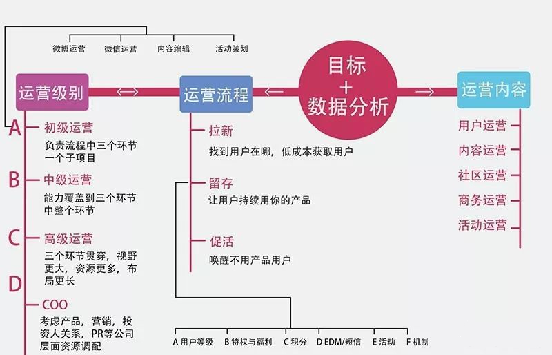 根据运营流程划分:拉新(找到用户在哪,低成本获取用户),留存(让用户持续用你的产品),促活(唤醒不用产品用户)。