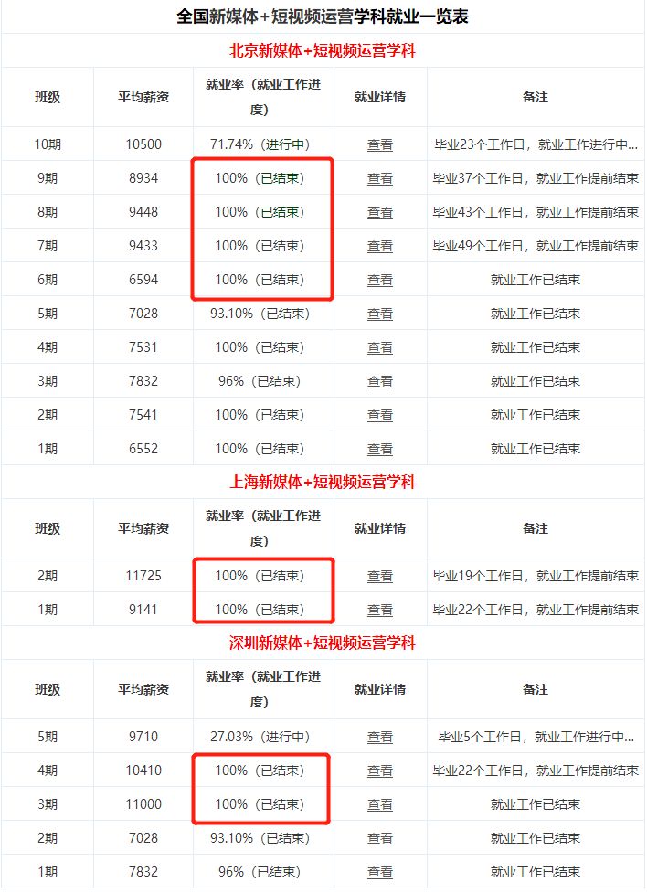 截止到目前2018年毕业的8个新媒体班级,实现就业率100%,学员就业平均薪资达到9k,同比去年提高2000。