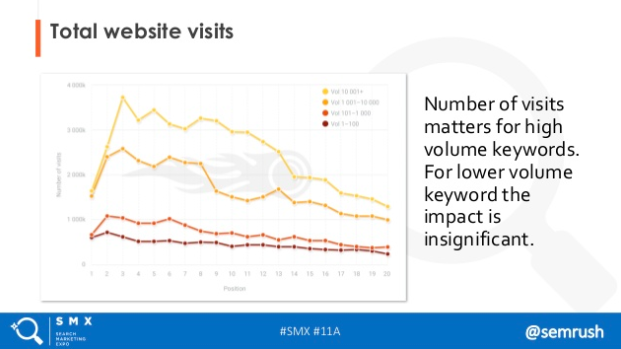 SEMRUSH研究了网站流量对排名的影响,发现用户数量是高查询量关键词中的一个重要因素,而低查询次数对排名影响不大。此外,搜索流量似乎对排名没有影响,但直接流量对排名有影响。