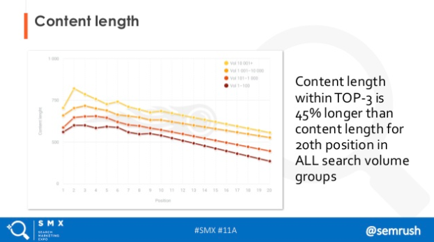 不管关键字查询的数量如何,内容长度通常与排名呈正相关,前三名的结果页面平均比第30位长45%。长尾关键字排名好的页面比顶部关键字长20%。