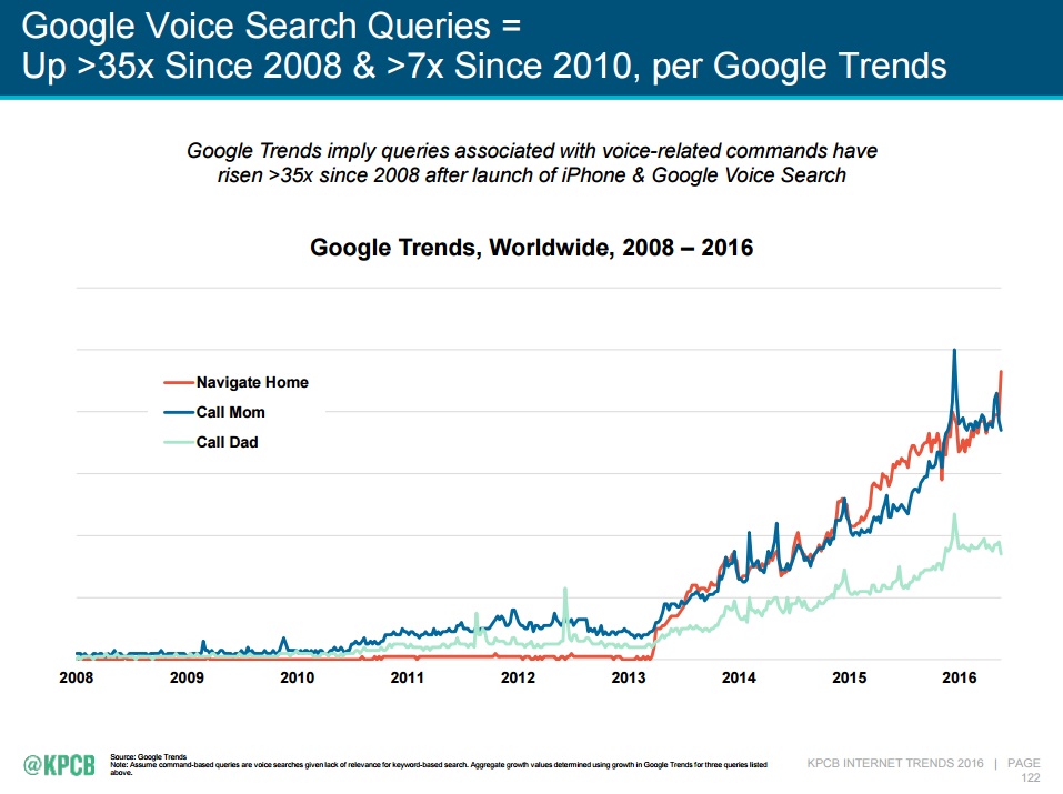 在Mary Meeker的2016互联网趋势报告中,它指出自2008年以来Google语音搜索查询已经上升了35倍。